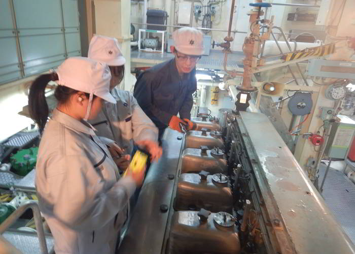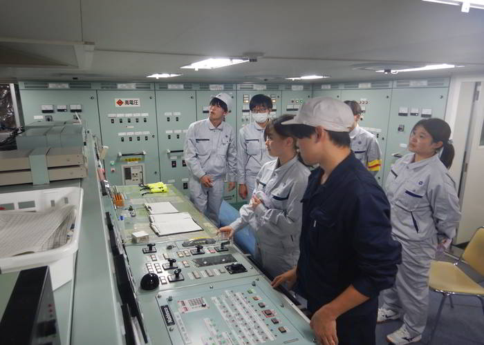 機関士から舶用機関について説明を受ける様子