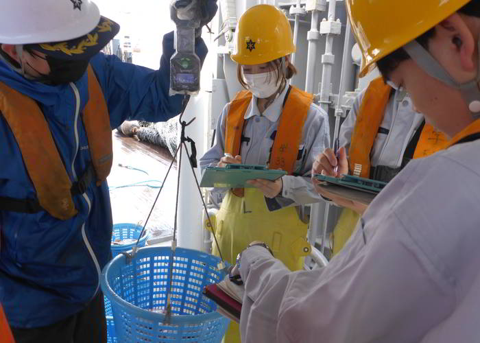トロール操業で漁獲した魚を種別に測定しました