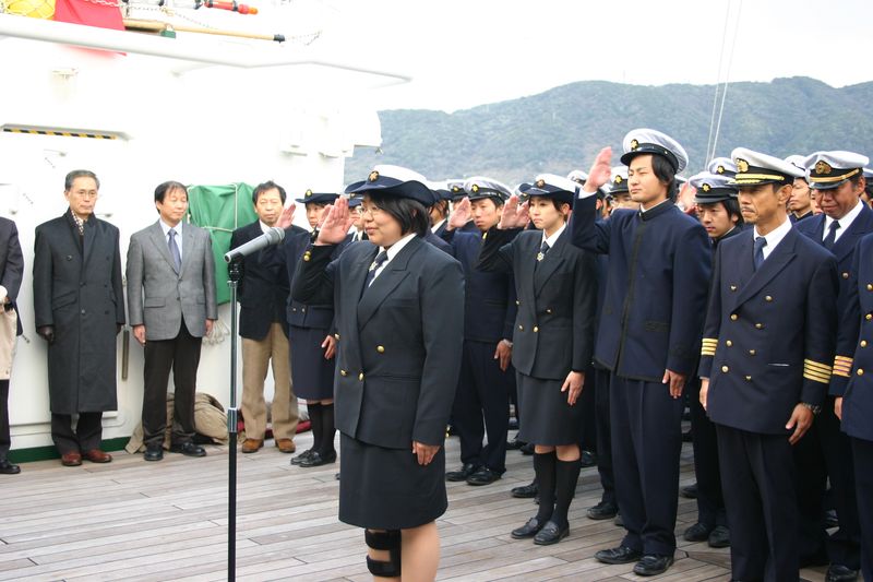 小雪の舞う中での帰港式