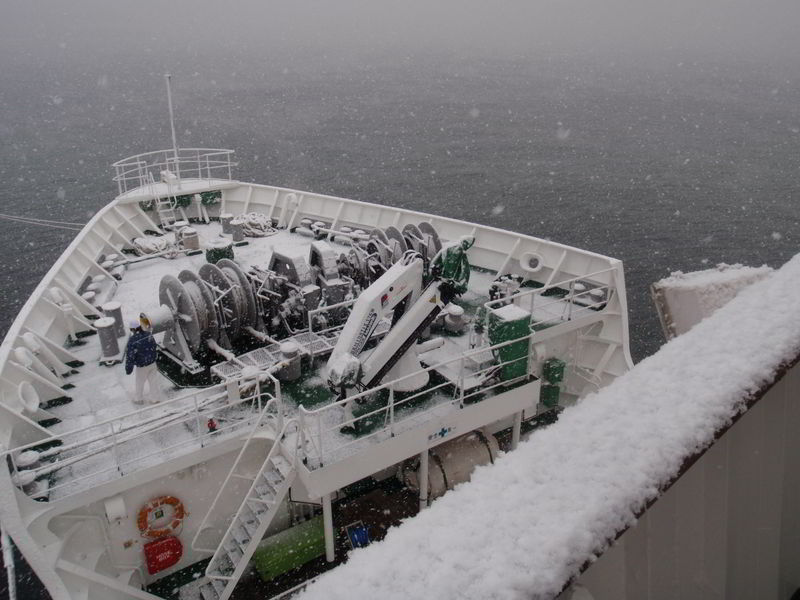 出港日の朝、雪化粧の耕洋丸