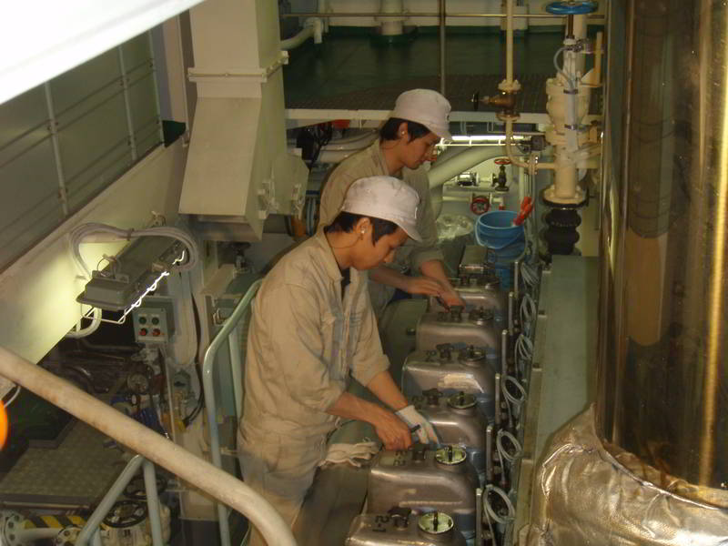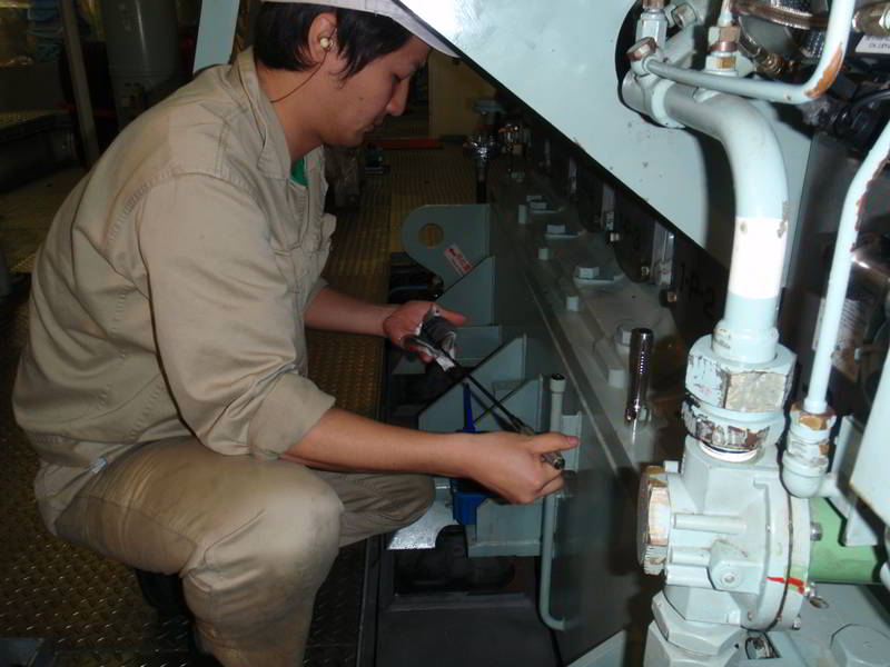 潤滑油の点検をする実習生