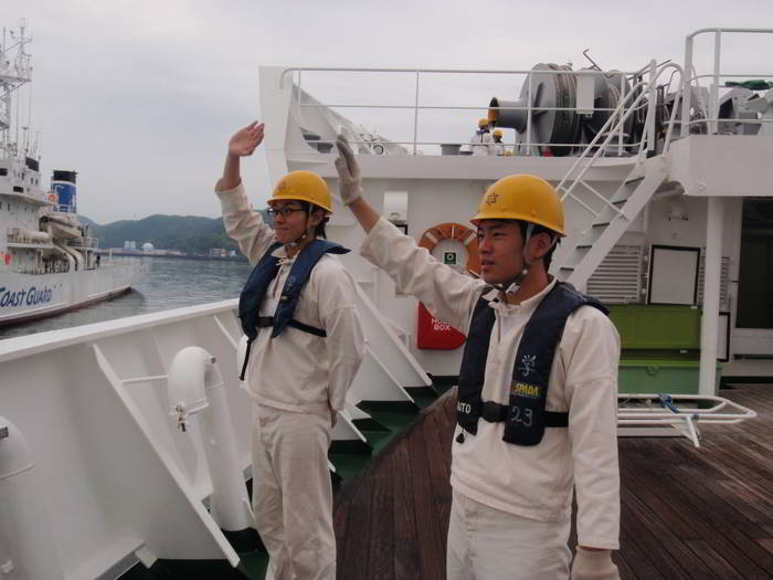 高知港の見送りの方に手を振る学生