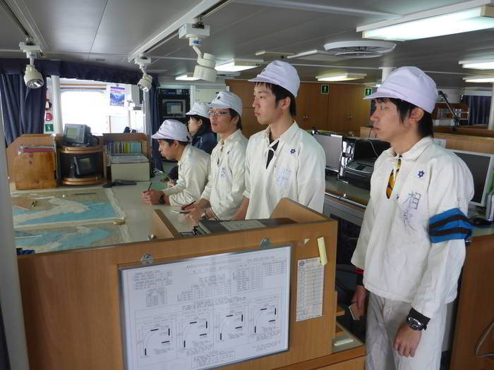 真剣に船橋の様子を見学する学生の様子
