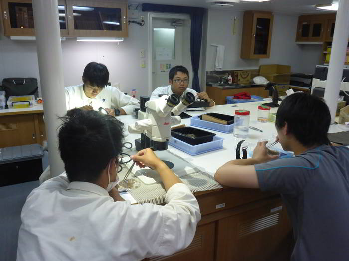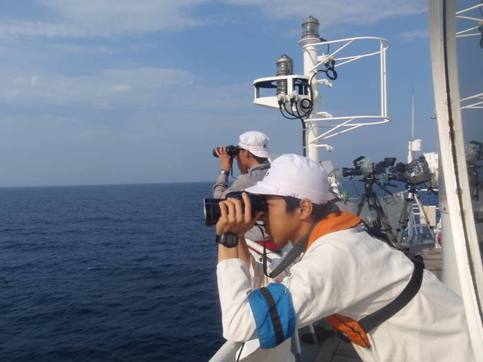 コンパスデッキにてマグロ目視調査