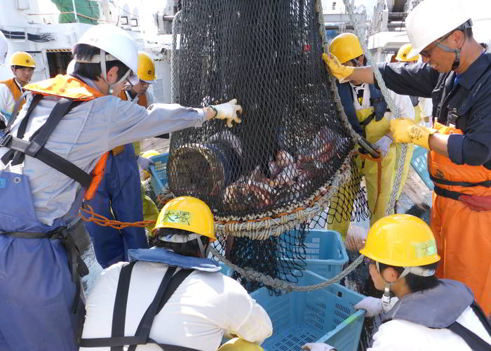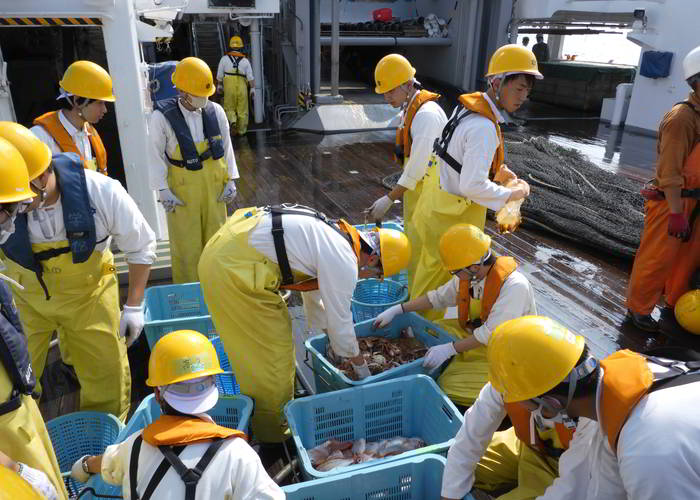 トロール漁獲物選別作業