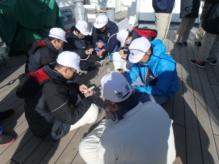 甲板上でロープワークを教わります。