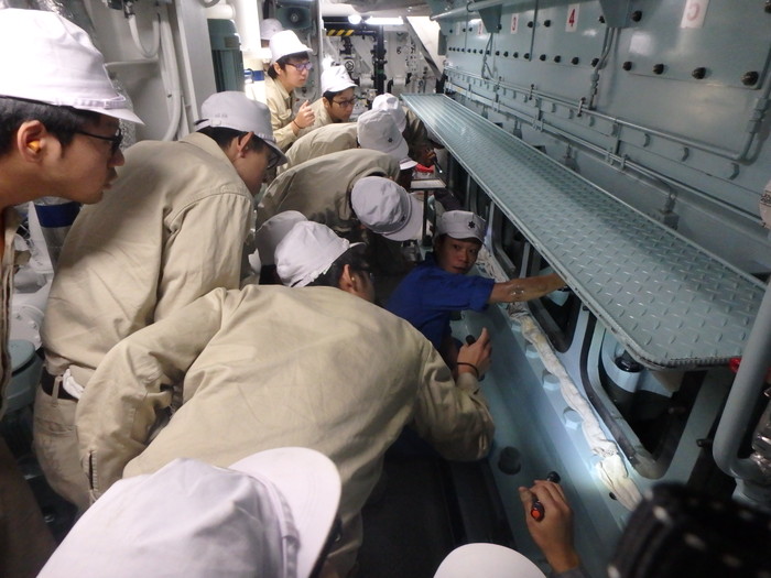 主機関のクランクケース内を見学して構造を学びます。