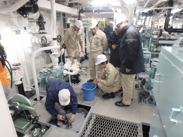 出港時の船底弁切換作業を見学します。