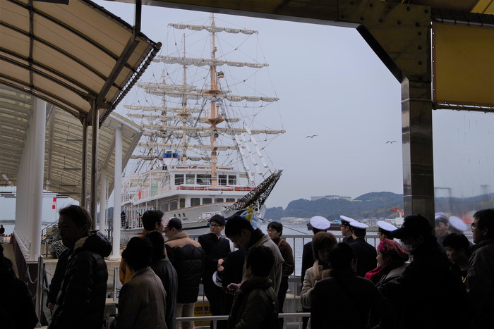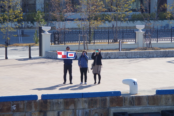 神戸港を出港、水大卒業生がUW旗にてお見送り。