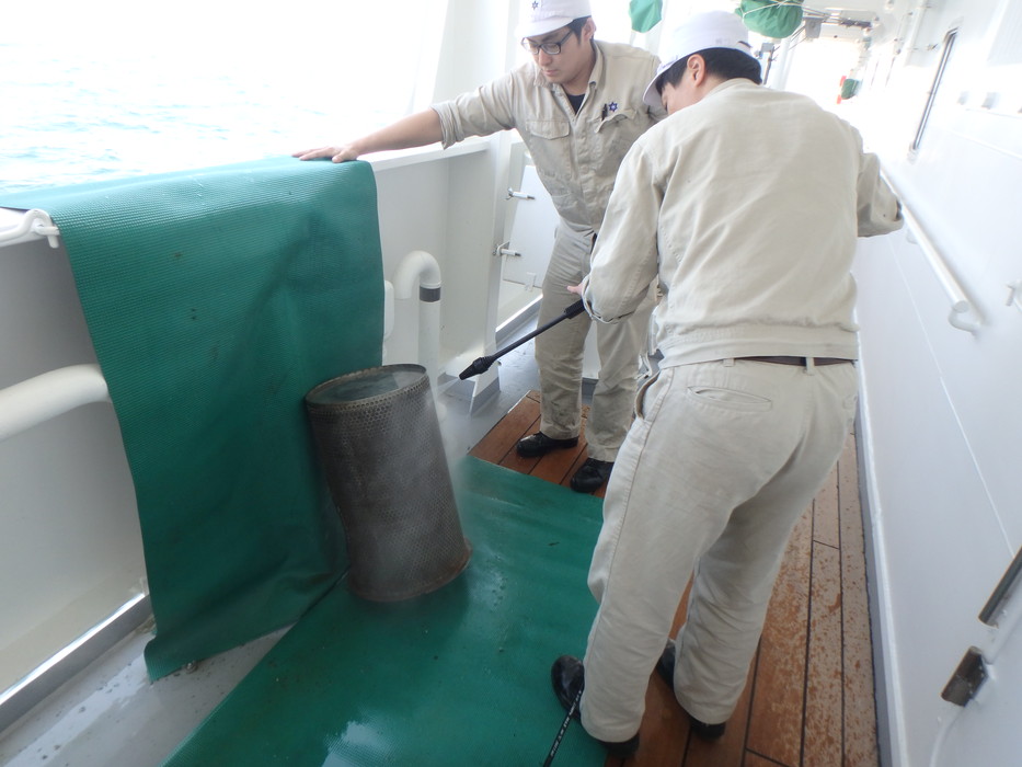 高圧洗浄機で船底ストレーナーを掃除します。