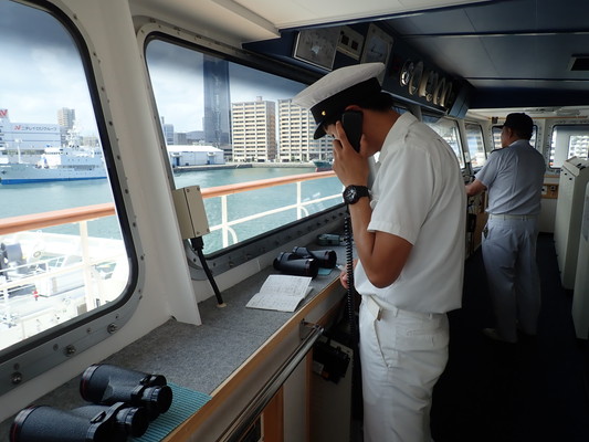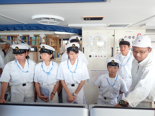 下関岬之町の船溜まりには他大学の練習船も停泊しており、東京海洋大学「神鷹丸」乗船中の学生と交流、本船の船内案内を行いました。