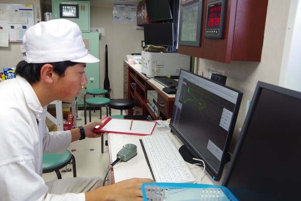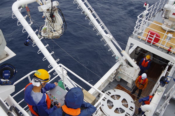 乗組員指導のもと、CTDウインチの操作を行っています。