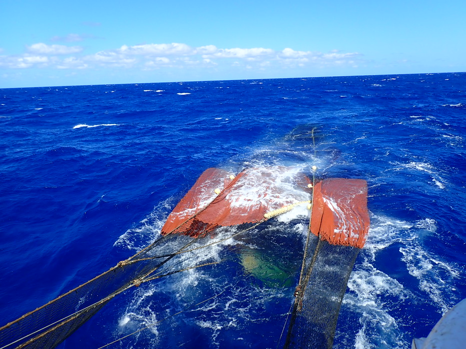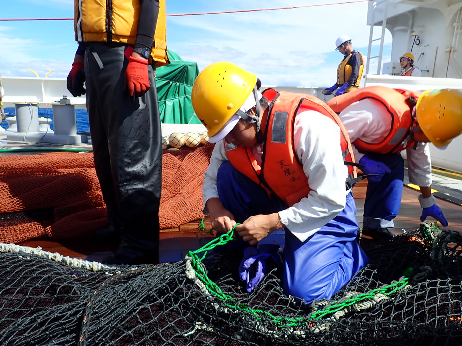 LCネットのコッドエンド部をチェーンノットで閉じています。