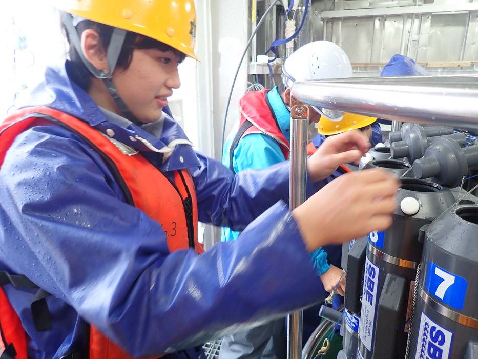 採水ボトルのセッティングをしています。