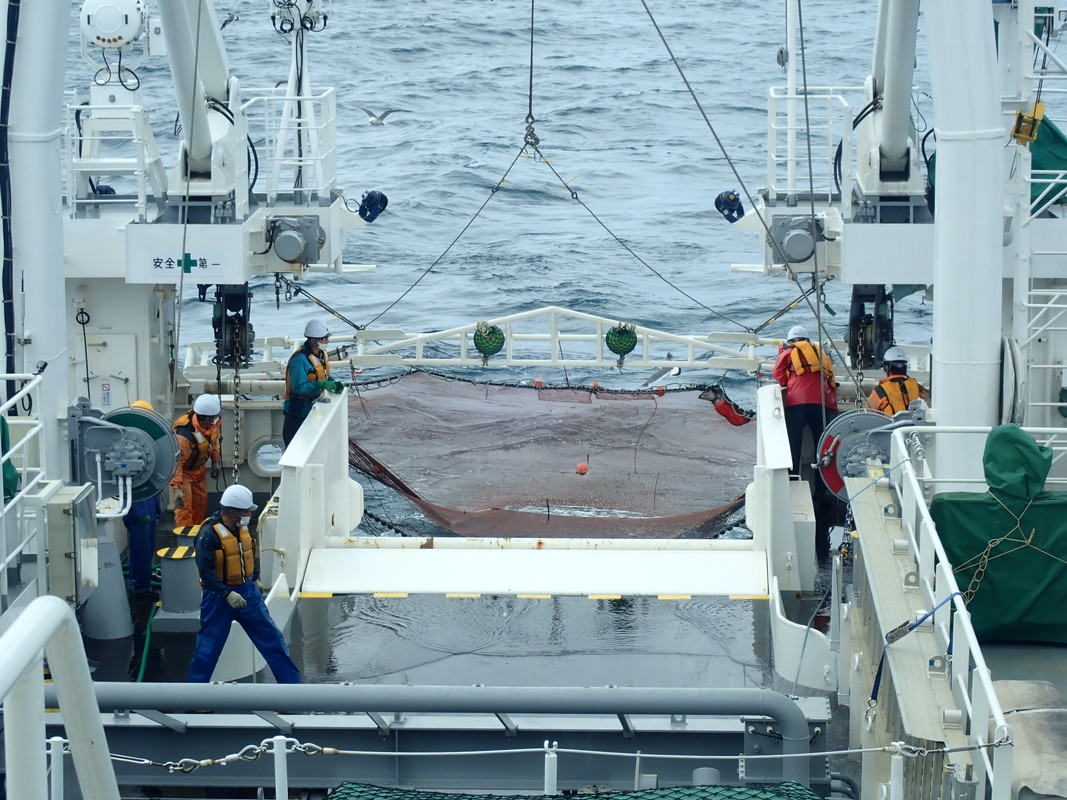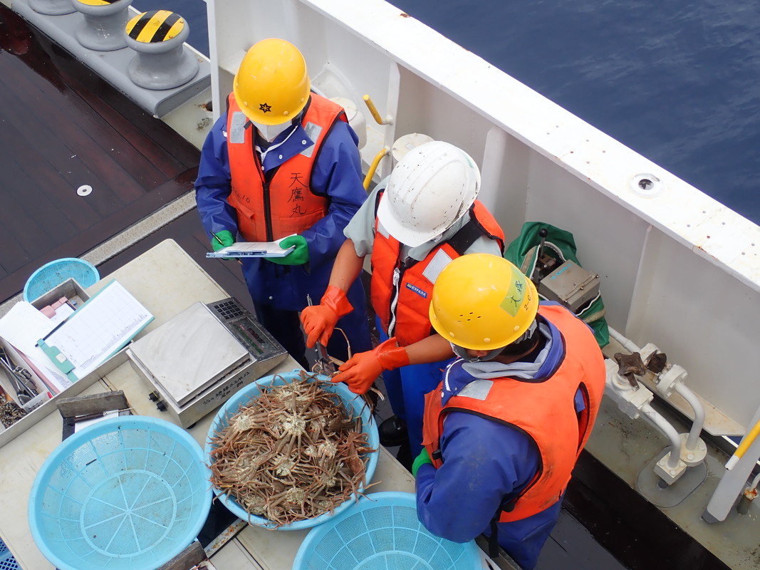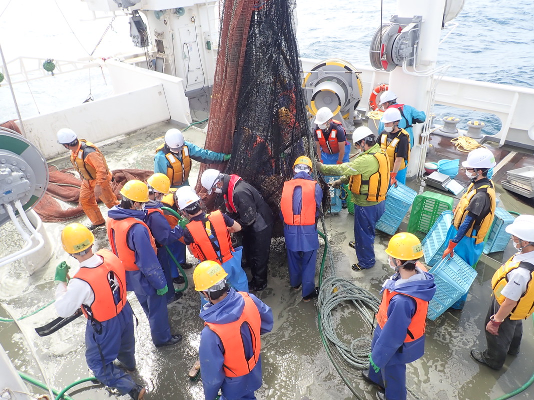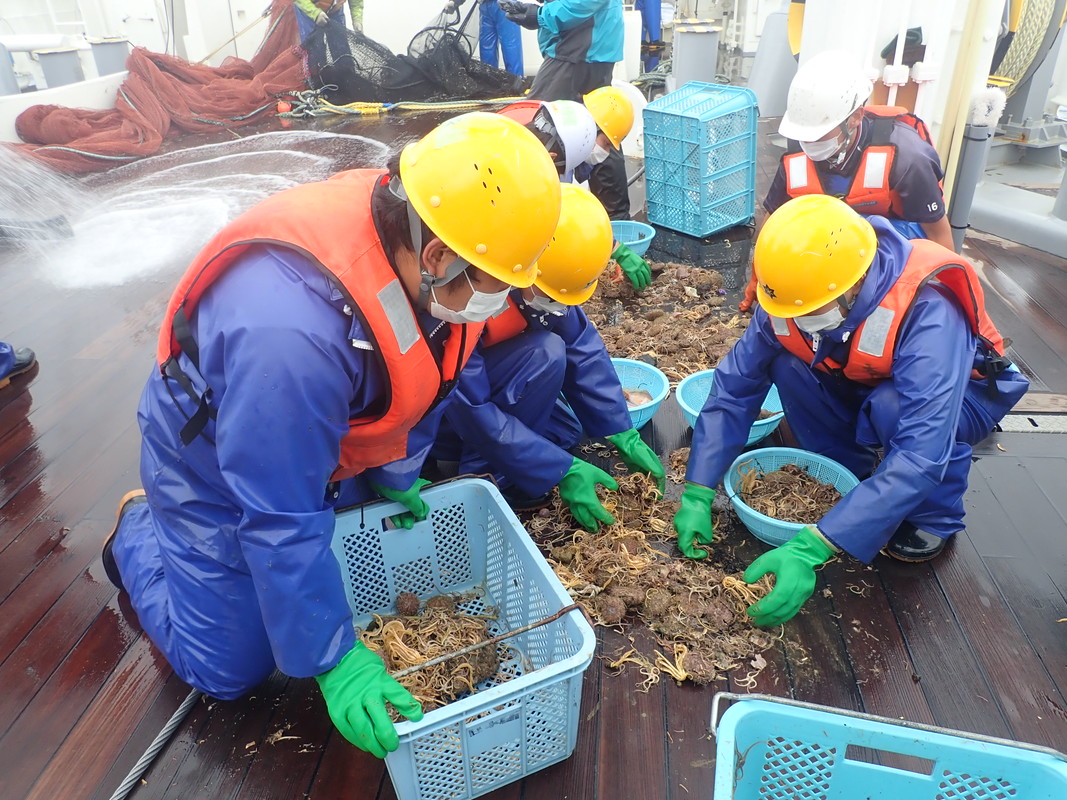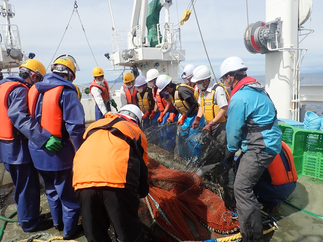 日本海北部で桁網を使用した調査を行いました。船尾から網を入れて海底の生物を採捕します。