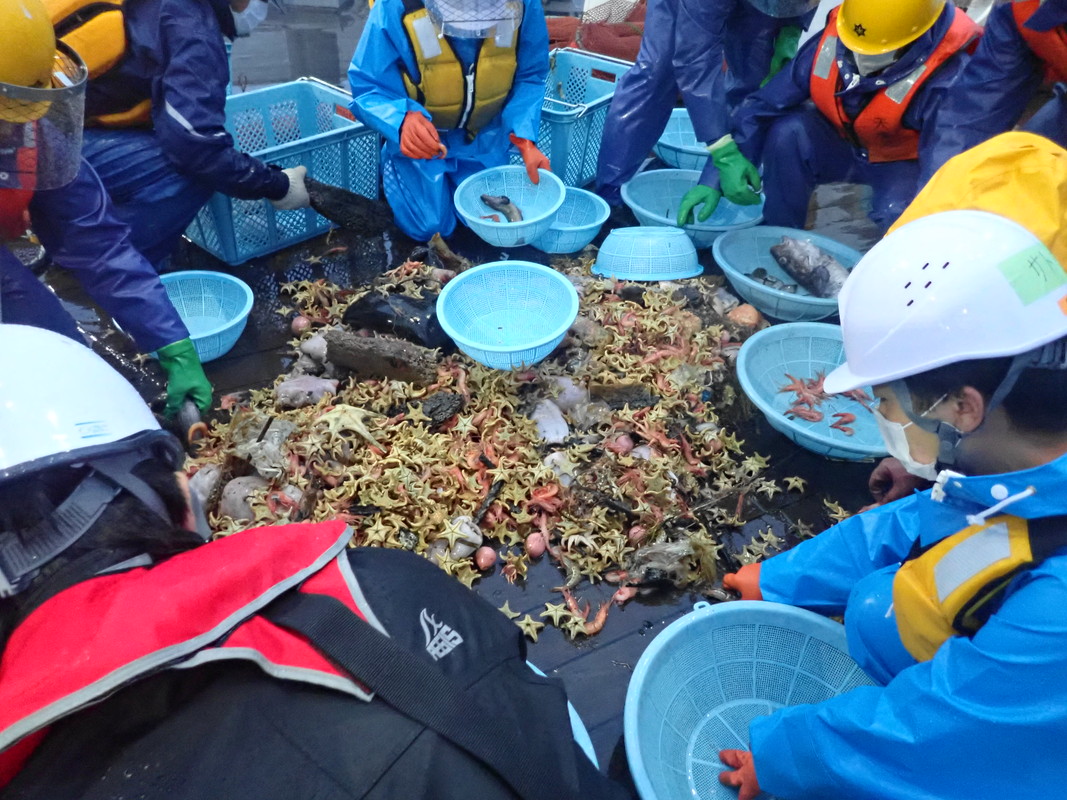 桁網で獲れた漁獲物を選別中。