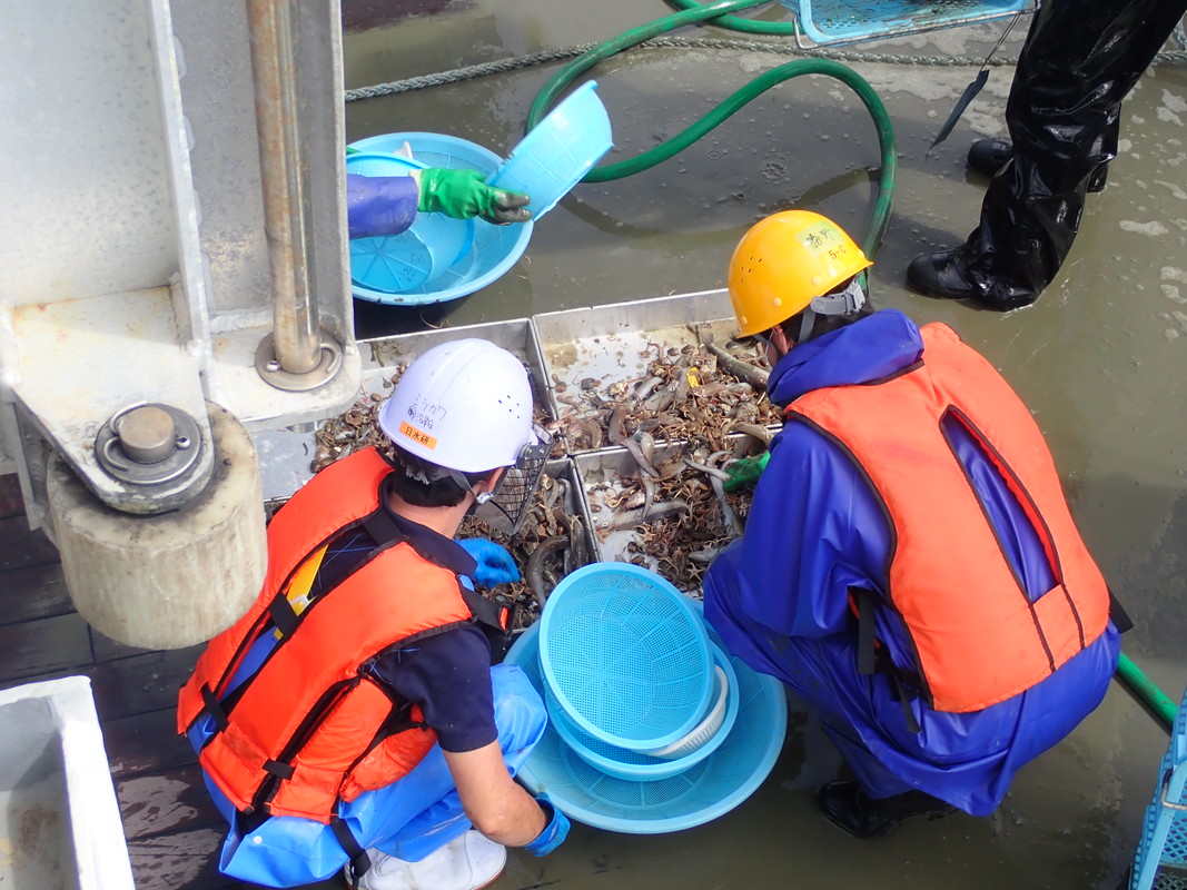 漁獲物を選別しやすくするために洗浄しています。