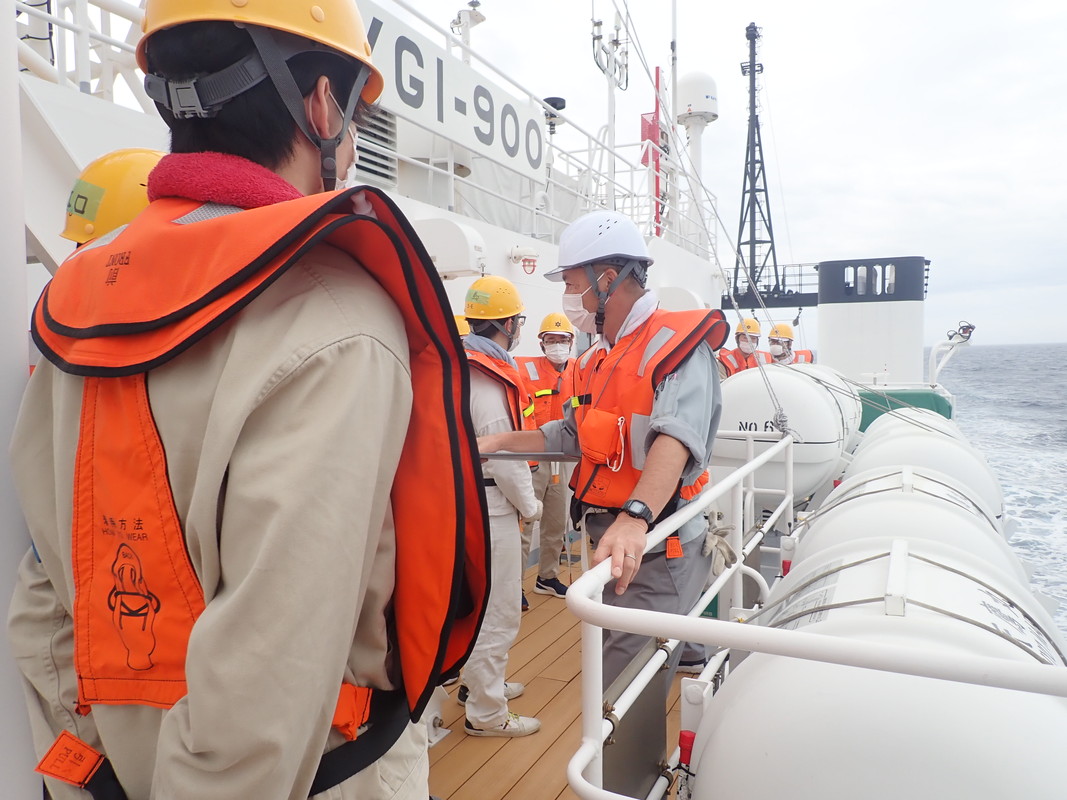 救命筏部署操練で自分が乗り込む救命筏を確認します。