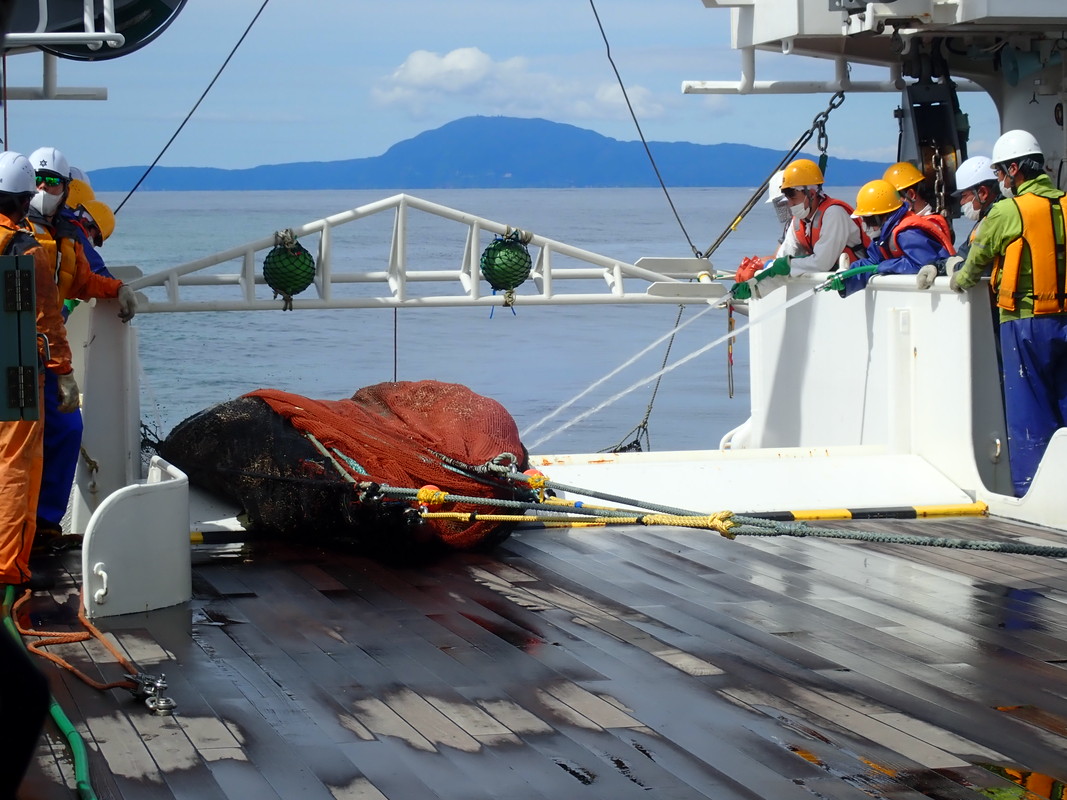 桁網のコットエンドを甲板上に揚収。