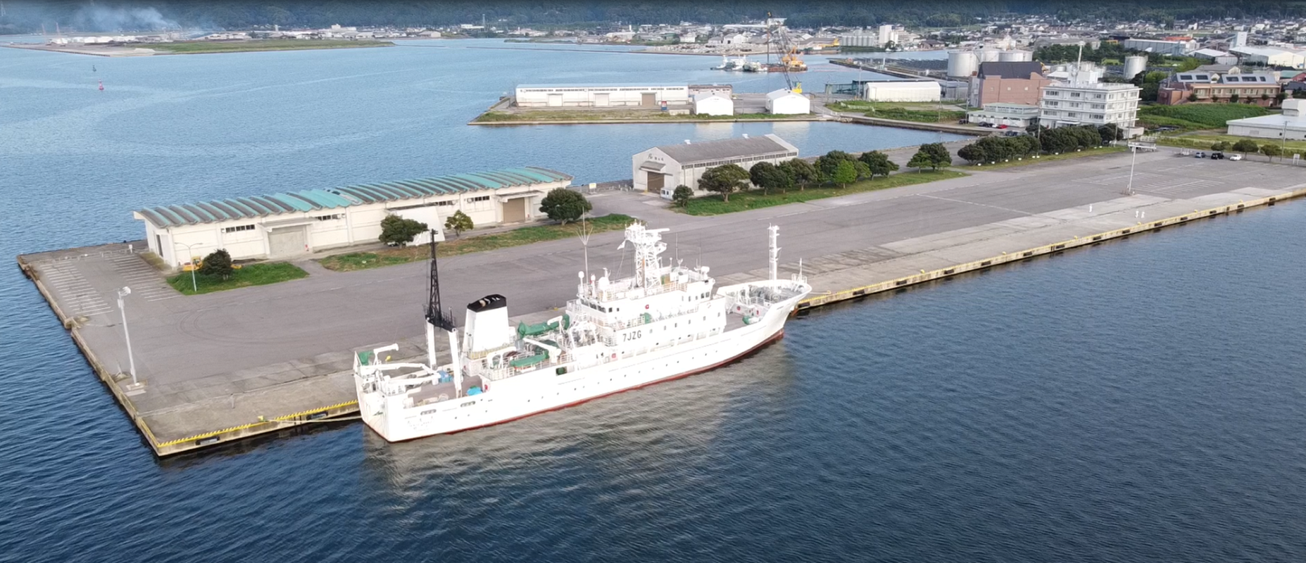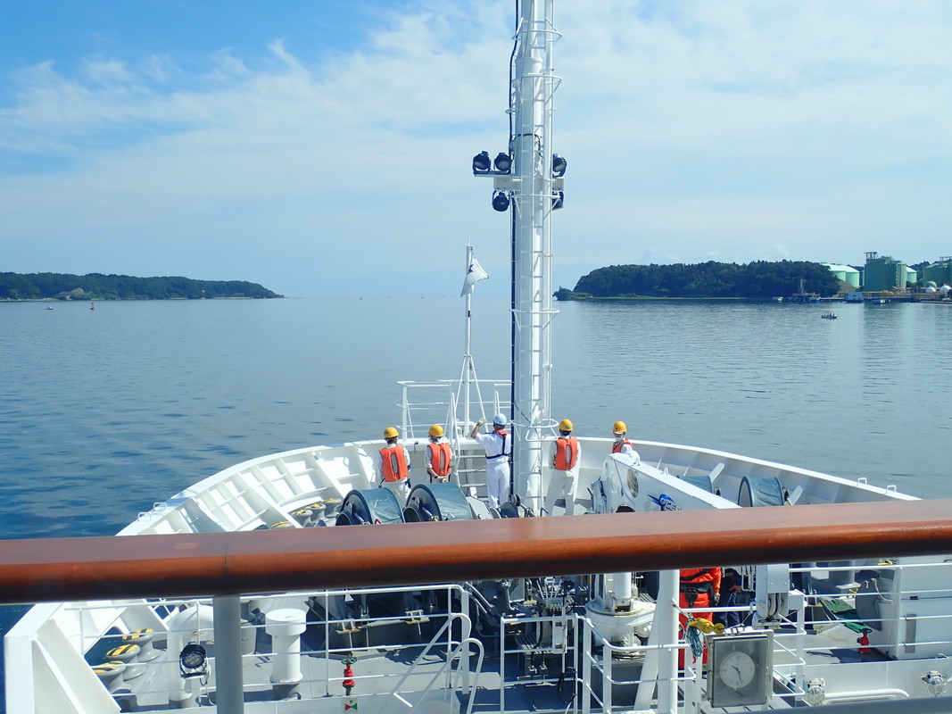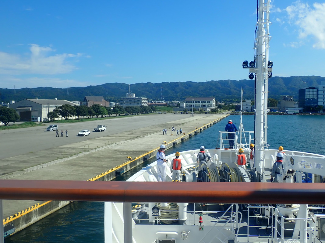 七尾港に寄港、調査員の交代を行いました。出港後は