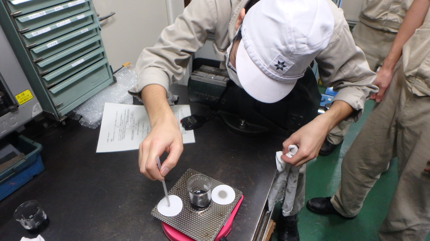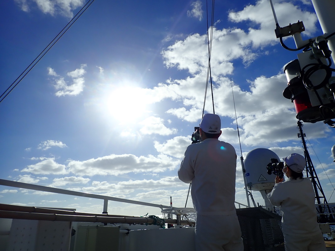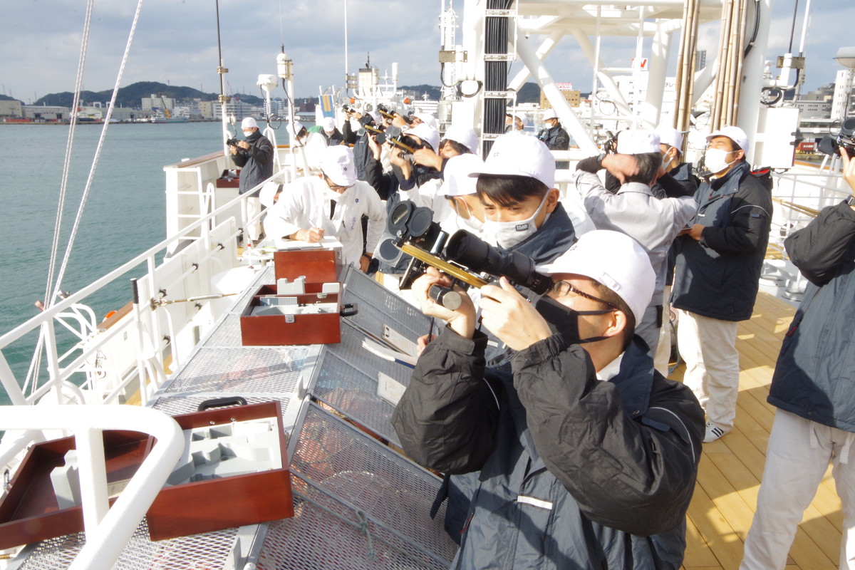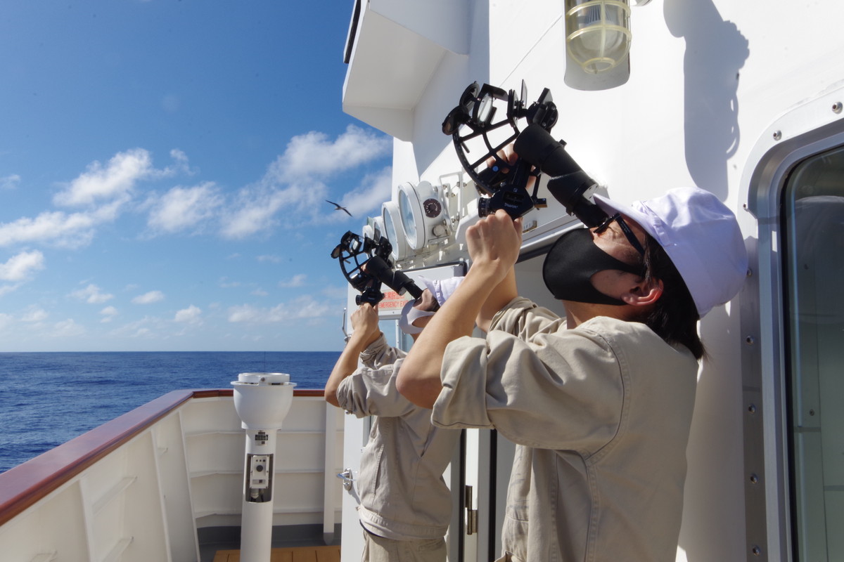 天測実習。太陽の高度を測定し自船位置を決定しました。