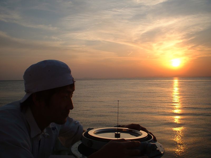 | 夕日をバックにコンパス方位測定 |