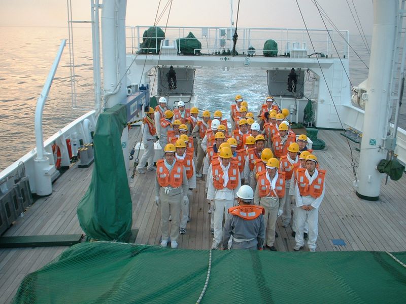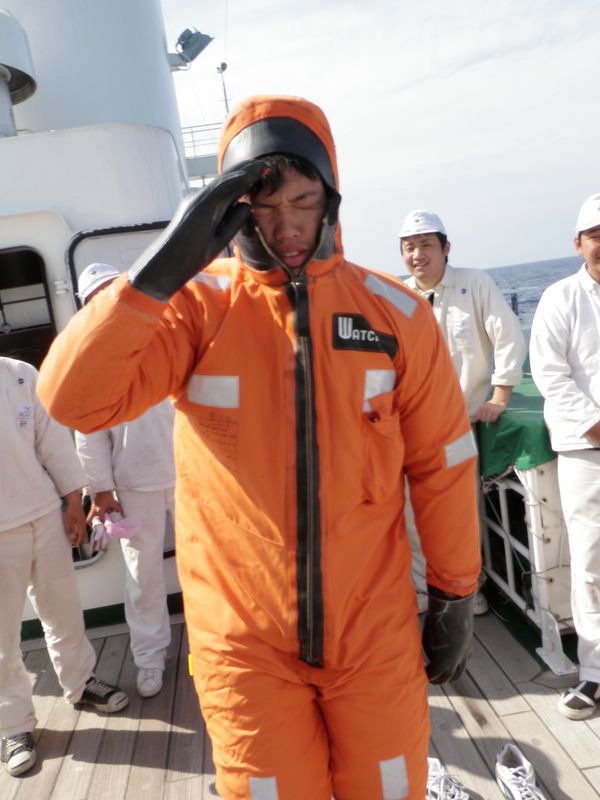出港後、救命筏部署配置操練を行いました。