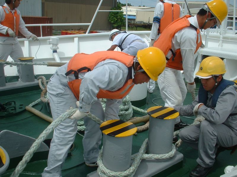 船首でのポンペイ港入港作業