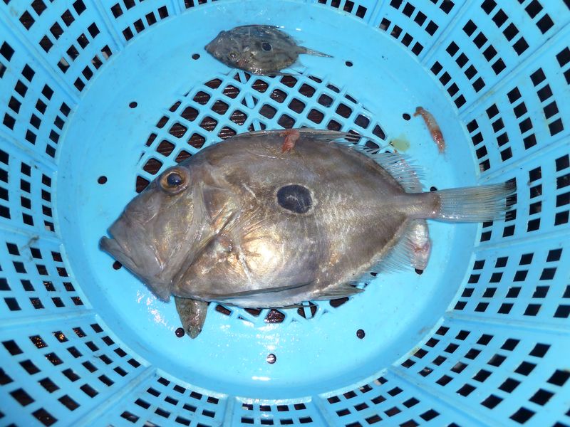 的鯛 暗灰色で、体側に1個の大きな暗褐色の円紋があり、