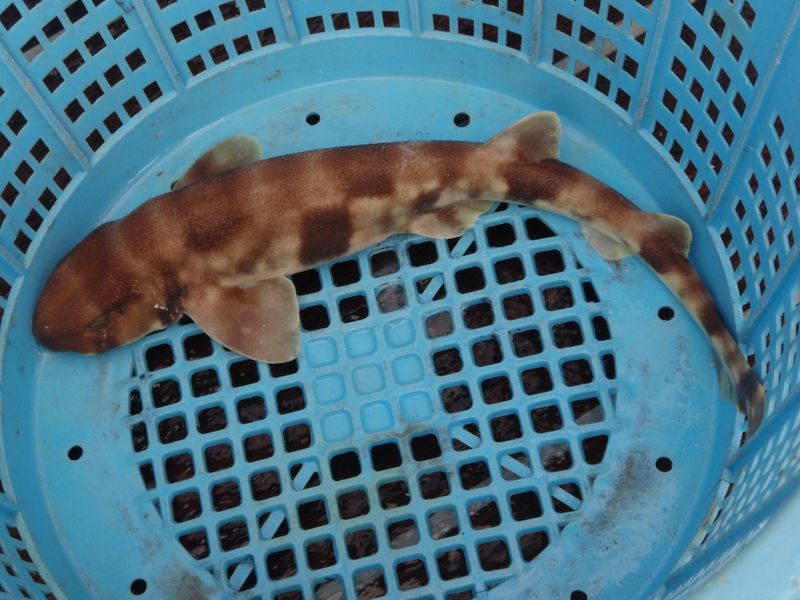 猫鮫 約1メートルで頭が猫に似る。茶褐色で、およよそ7条の幅広の褐色の横帯がある。物をくわえると暴れない習性がある