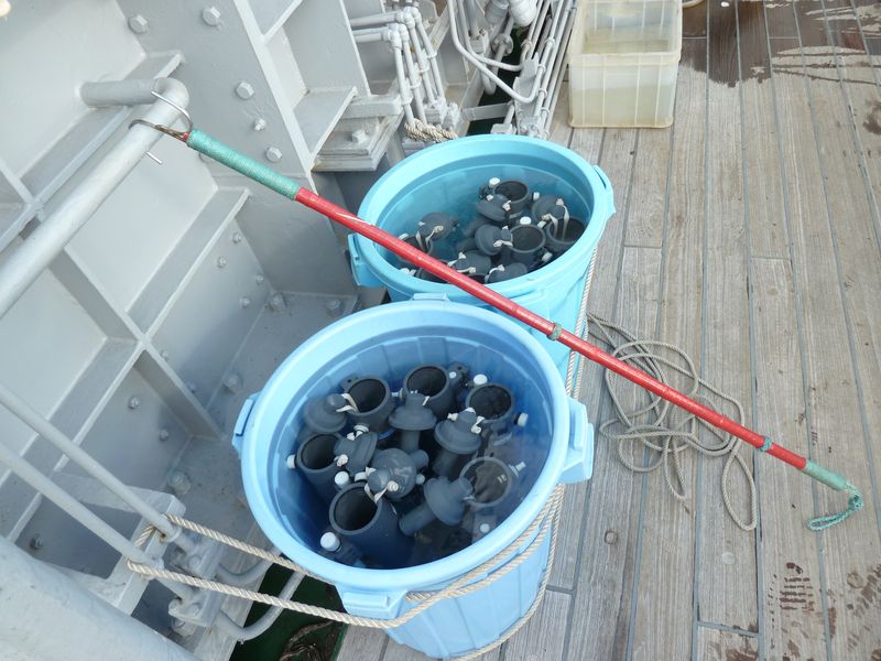 ニスキンボトル CTDに装着され、任意の水深で蓋が閉じ