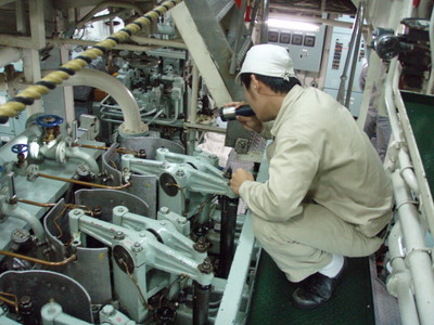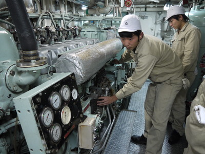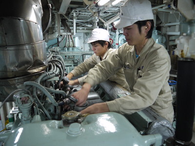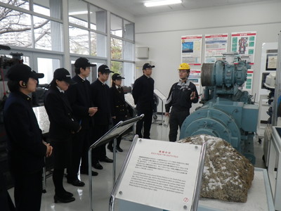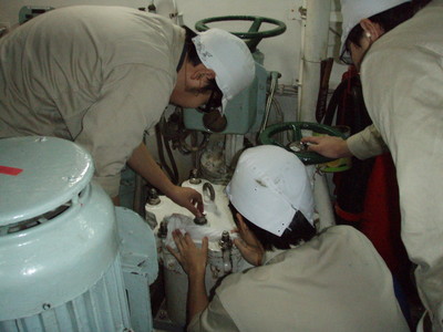南極昭和基地で使用されていたヤンマー製発電機関です。みんな興味津々です。