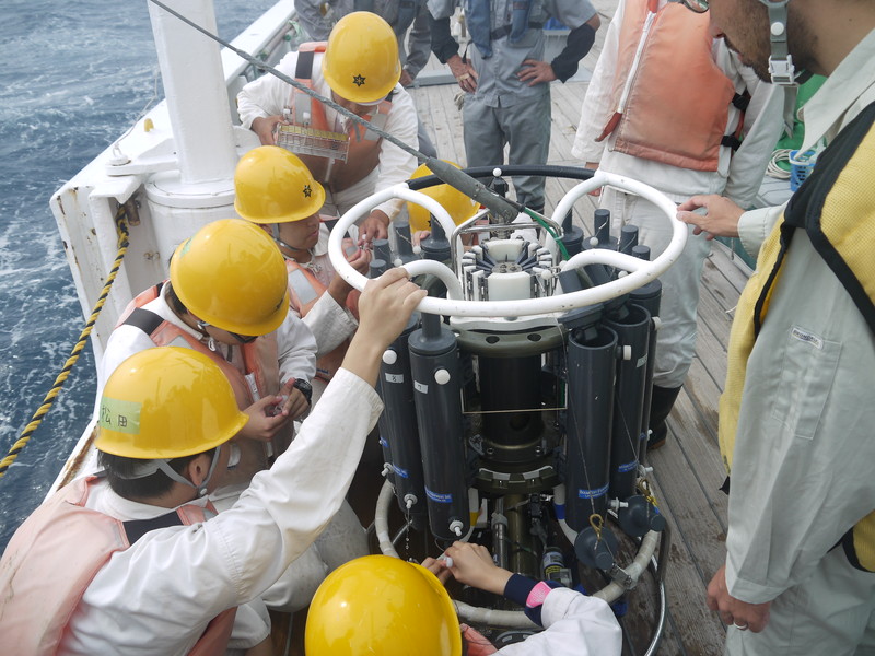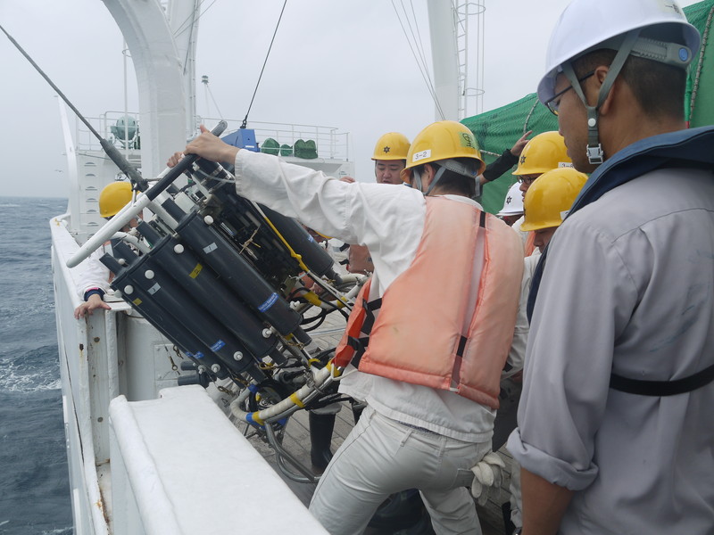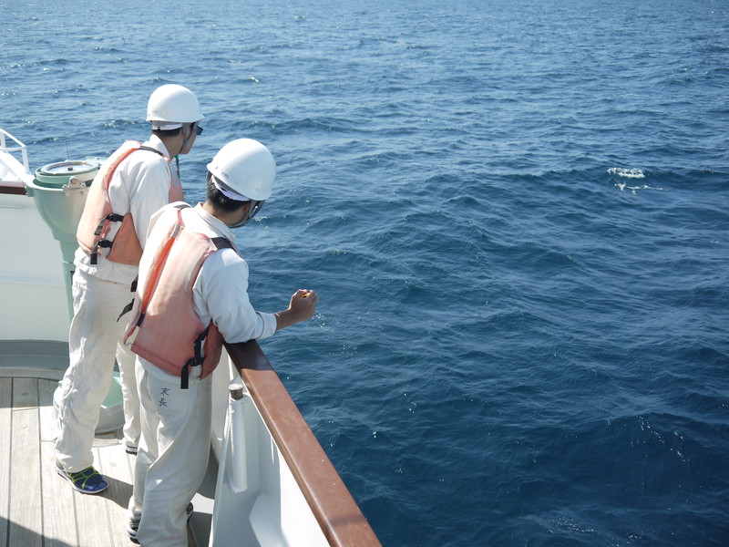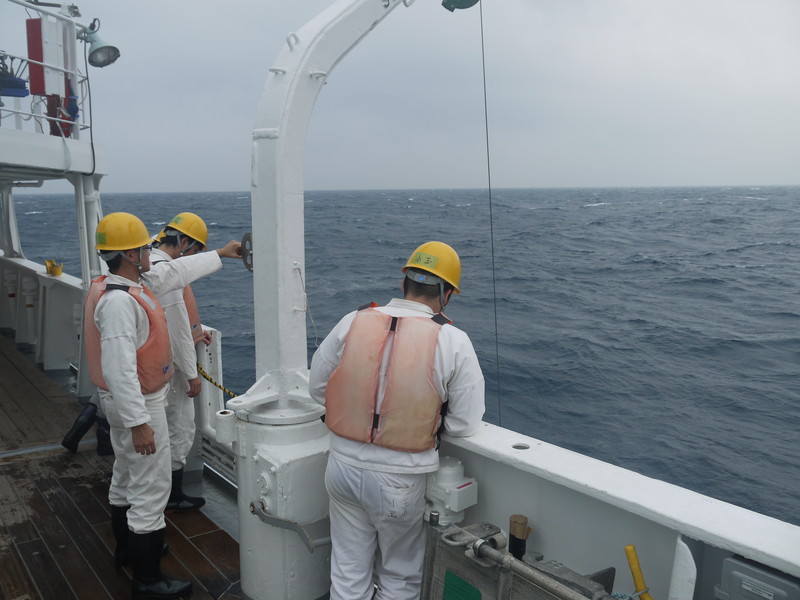 CTDのワイヤーが真っ直ぐ落ちているか確認しています。 |