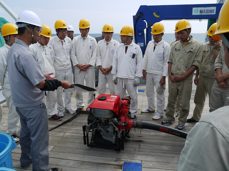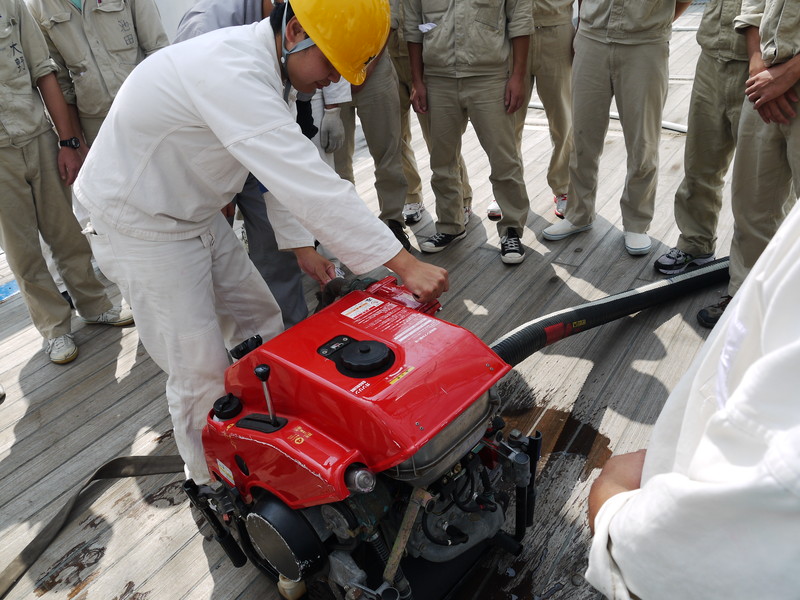 | 下関入港前に非常消火ポンプのテストをしました。 |