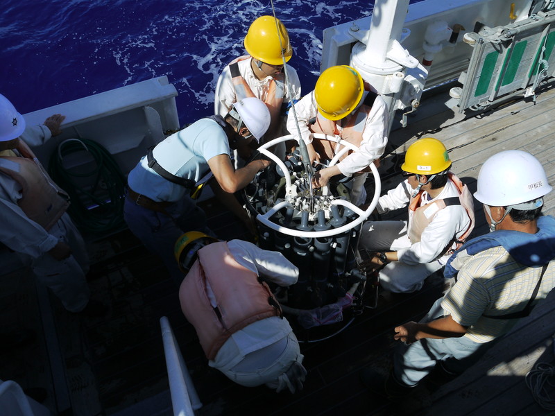 CTDで採水してきた海水をボトルに移します。 |