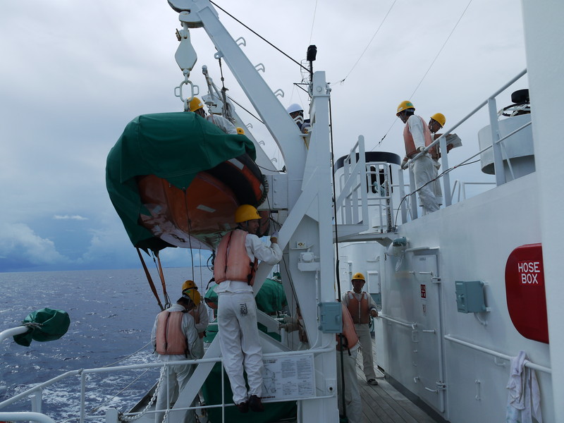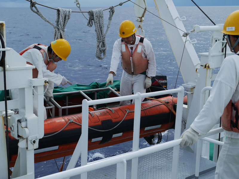 | 調査の合間に、救助艇を点検しました。 |