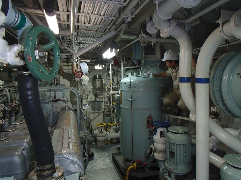 出港時の機関室の様子です。機器の運転状態の確認を徹底して行います。 |