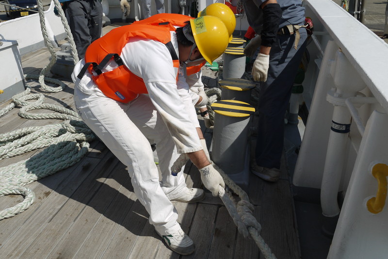 ストッパーを取り、ボラードヘ締めれば入港です。 |
