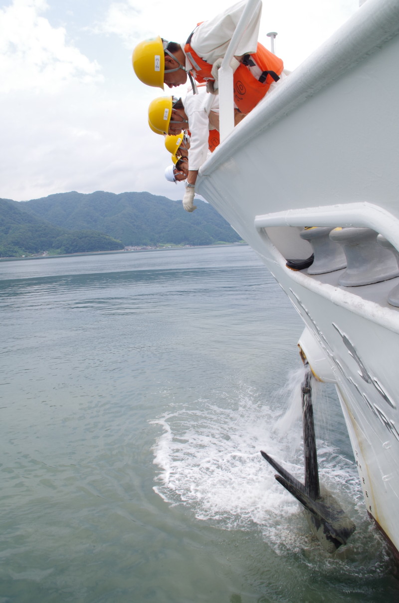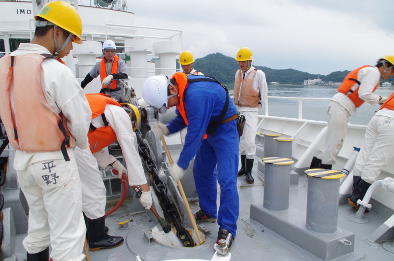 | 錨鎖の泥を洗いながら巻揚げます。 |