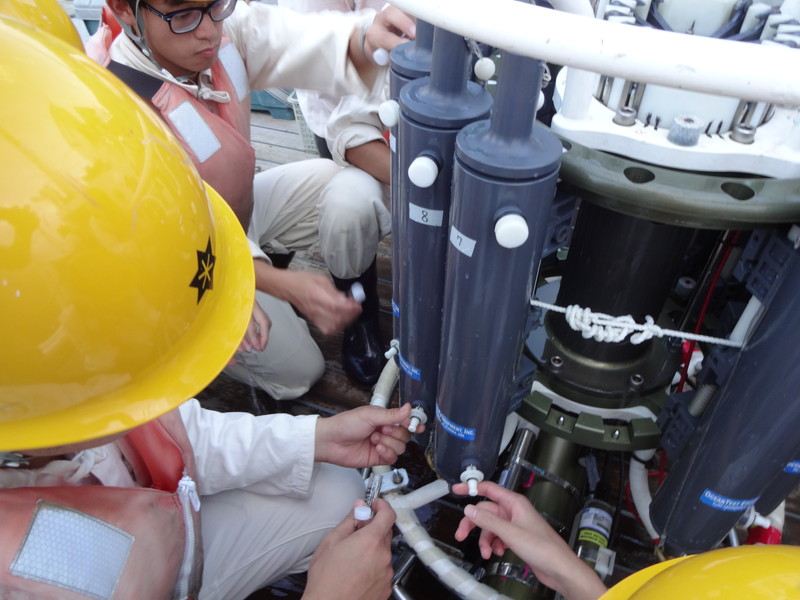 ボトル採水した海水をサンプル瓶へ移します。 |