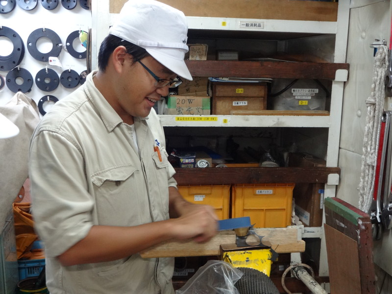 工作実習で自作した多機能文鎮をきれいに磨きます。 |