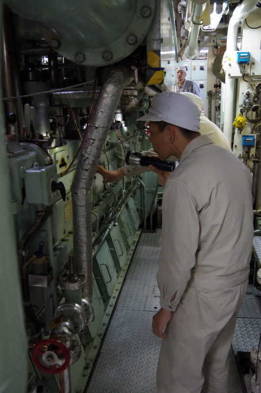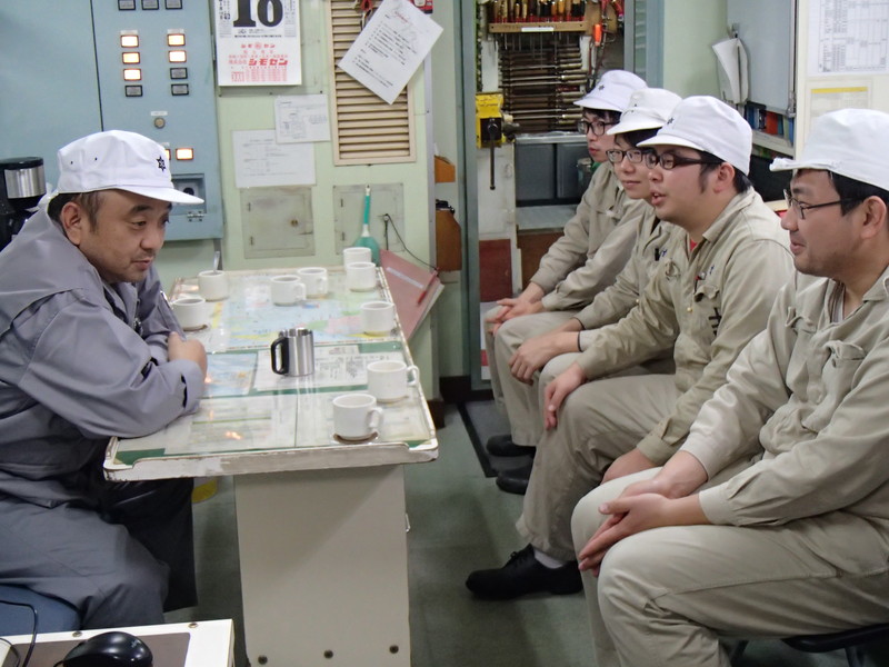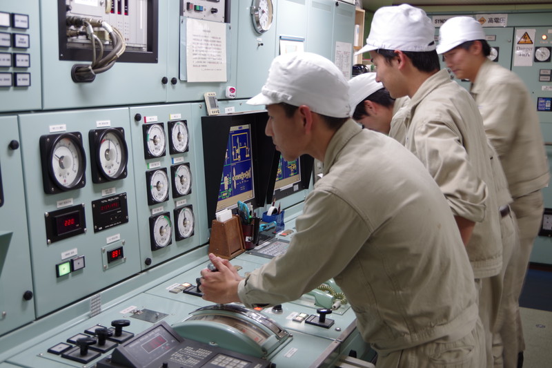 制御室で機関長の講義を受けます。 |
