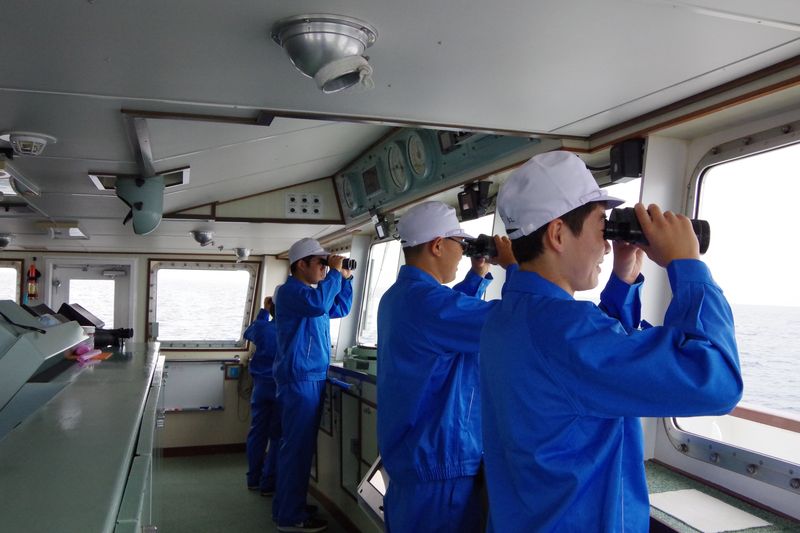 船橋から周囲をよく巡視します。 |