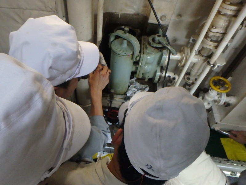 主機関の燃料ストレーナーの掃除をしています。 |