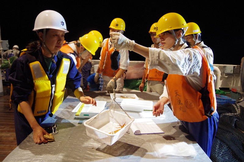 | トロールで獲れた漁獲物を仕分けし、データを取ります。 |