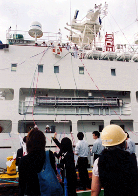 造船所関係者に見送られて岸壁を離れる耕洋丸