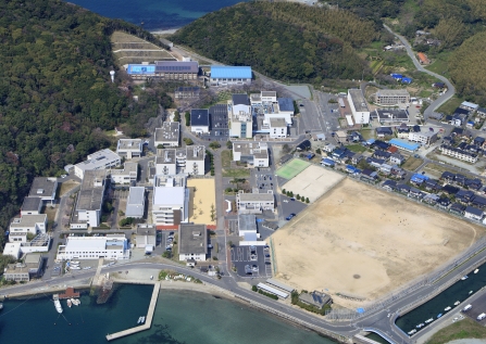 本州の最西端、山口県下関市にある水産大学校は、群青の響灘と緑豊かな森に囲まれています。美しい自然に囲まれたキャンパスを上空から眺めてみましょう。