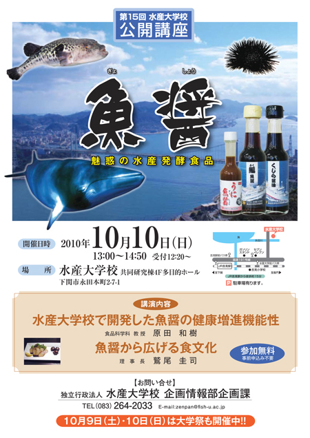 水産大学校の設置目的に、水産に関する研究と教育がある。そこで、食品科学科に所属する自分の研究テーマとして、10年前の着任当時、日本では滅びつつあった水産食文化の魚醤(魚醤油)を取り上げた。更に、卒業研究の教育の一環として、歴代の卒論生達と共に、下関特産の水産資源で魚醤を作ろうということになった。タイのナンプラーなど東南アジアの魚醤は有名であるが、その独特の癖のある風味は多くの日本人の喜ばれるとは言い難い。そこで、卒論生達からの希望として「生臭くない魚醤を作りたい」と申し出があり、私の中に、「生臭くなくては魚醤ではないだろう」という思いがあったが、卒論生達の意見を尊重した。一方、私の方からも、卒論生達に希望を出した。それは、ただ単に魚醤を作るだけでは、大学の卒業研究というには、あまりにも心もとない。そこで、高い健康増進機能性を持つ魚醤を作ろうということを提案したのである。